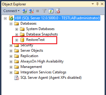 Looking at the SQL instance after running the restore, we now have our database available to us in SQL Server Management Studio.ย As you can see we now have the RestoreTest DB mounted where we can extract data, tables, review data, etc.