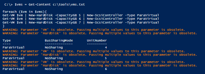 $vms = Get-Content c:vms.txt foreach ($vm in $vms){ Get-VM $vm | New-HardDisk -CapacityGB 300 | New-ScsiController -Type ParaVirtual Get-VM $vm | New-HardDisk -CapacityGB 500 | New-ScsiController -Type ParaVirtual Get-VM $vm | New-HardDisk -CapacityGB 500 | New-ScsiController -Type ParaVirtual }