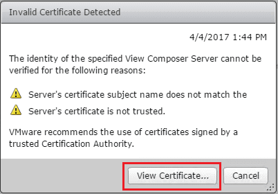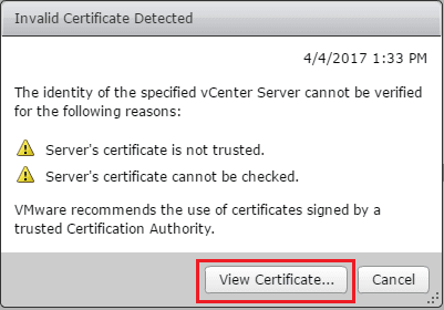 Here if using self signed certificates, you will see a certificate warning. ย To move forward and actually accept the certificate, you have to click theย View Certificate button.