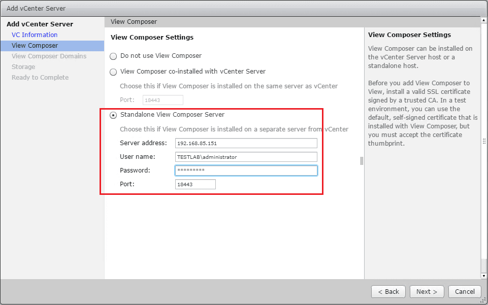 Next, we configure theย View Composer Settings. ย I am choosing to use aย Standalone View Composer Server since I have that installed on a separate VM. ย View Composer is needed for linked clones and instant clone technology.