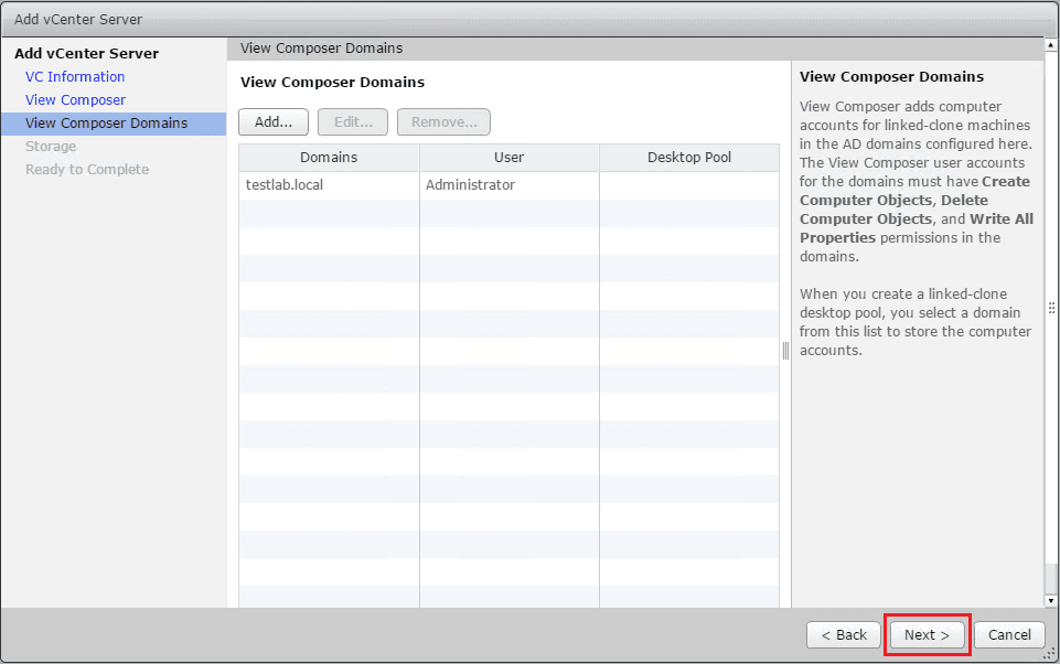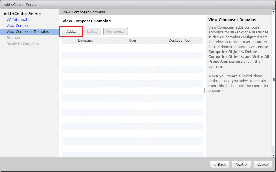 On theย View Composer Domains, we can configure Active Directory domains here t have the View Composer to automatically be able to add computer accounts to.