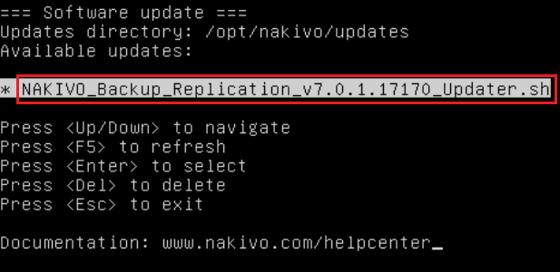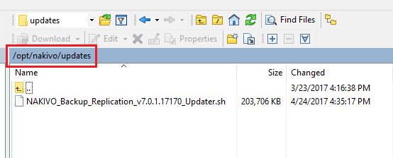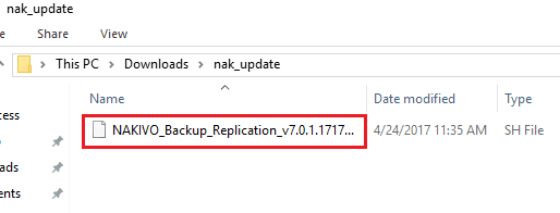 Here we see the file in the /opt/nakivo/updates directory after we have it uploaded.