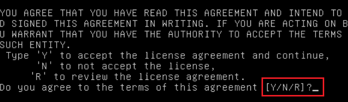 We will first need to agree to the license agreement that prompts us. Simply enter a โYโ to agree to the license prompt.