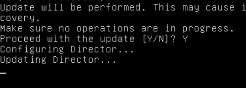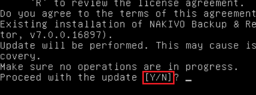 Finally, we are prompted to proceed with the update. Note As the updater script warns us, we need to make sure there are no jobs running before we proceed with the process. After we have verified no jobs are running, we simply enter โYโ again to start the update.
