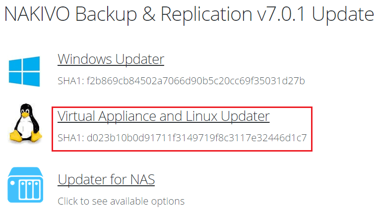 When you click the Download button, you are taken directly to the download link for the patch. Here we choose which version of the product we are updating. Since I am using the Virtual Appliance, I choose the Virtual Appliance and Linux Updater.