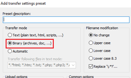 Now, we simply need to copy up the updater.sh file to the appliance. We need to upload it to the /opt/nakivo/updates directory. In this example I am using WinSCP to copy up the file to the server. Make sure that you have binary transfer mode selected to upload the file.