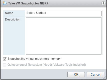 Since we have the appliance running in VMware, we want to take a snapshot before we actually run the updater script. So, letโs take care of getting the snapshot created.