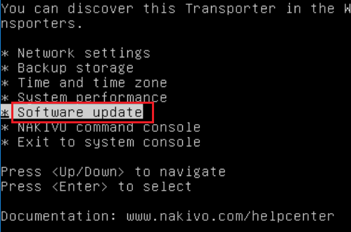 Now, we need to connect to the console of the virtual appliance and select the Software update option.