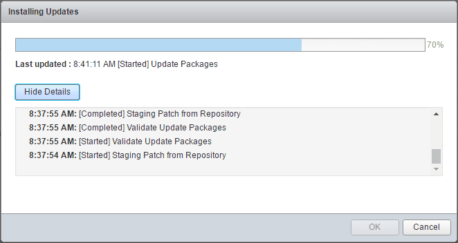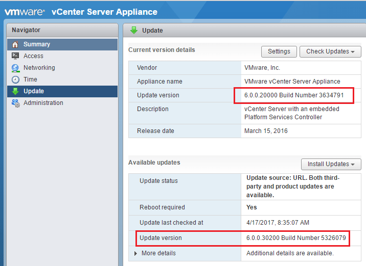I ran into issues trying to use the default URL that was set for pulling down updates, so I used the method that was posted by Vladan on using the lightweight HFS web server to perform offline patch using the depot file. ย You download the repo .zip file from VMware and then use the HFS server to spin up a quick web server to point your VCSA appliance to. ย Once I had the web server setup, I simply let it pull the available update I had already downloaded via the depot file for U3b. ย As you can see below, the update isย 6.0.0.30200 Build Number 5326079.