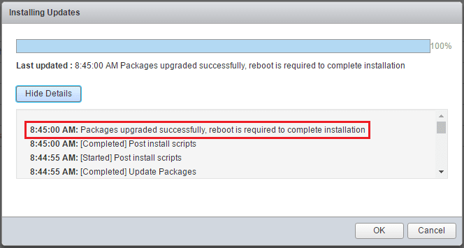 In a short amount of time, the update was applied. ย As noted by the updater, a reboot is required to complete installation.