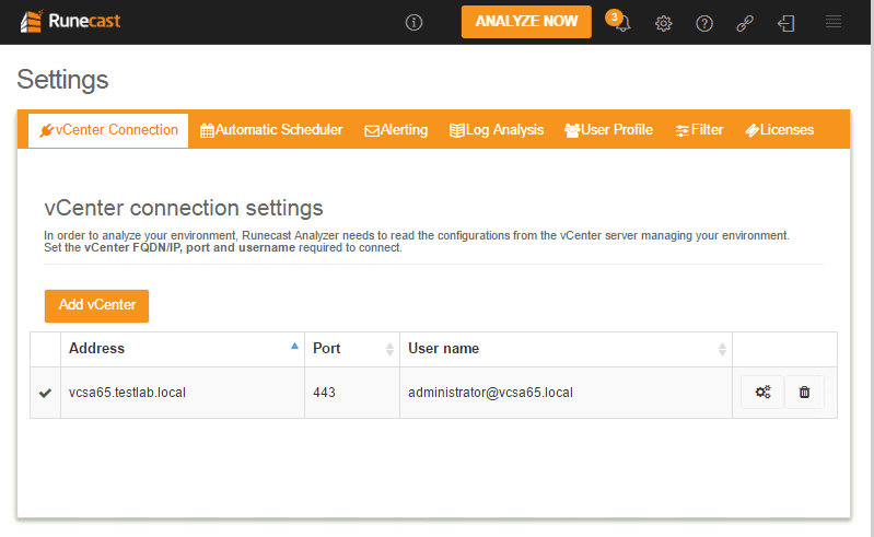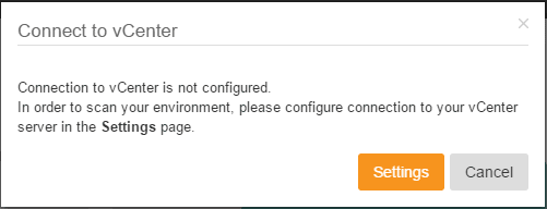 The first thing that we are prompted to do is to integrate our Runcast Analyzer installation with vCenter Server. ย Click theย Settings button to get started.