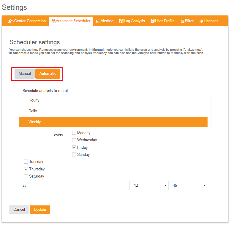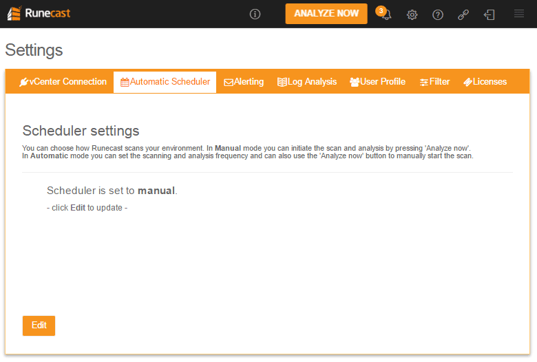The next tab,ย Automatic Scheduler, allows us to choose whether we want the Analysis scans to run automatically or manually. ย We can click Edit here to set the configuration. ย If we choose to run it automatically, we canย schedule the time of the analysis runs.