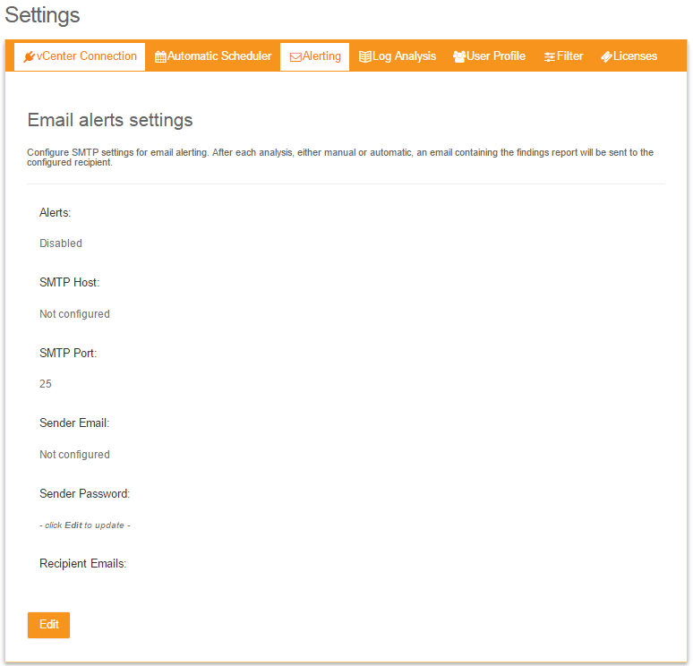 On the Alerting configurationย tab, we can configure our SMTP server to receive emails after the analysis runs and the findings report to be sent via email as well.