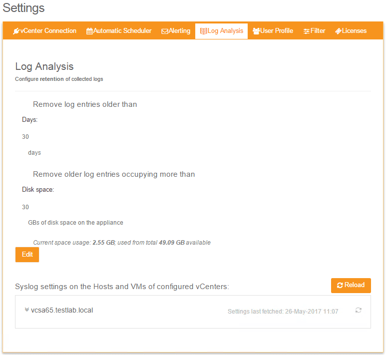 On theย Log Analysis tab, we can configure retention of the syslog logs that are kept from the environment. ย Also, we will talk more about this below, but we can also automatically configure our ESXi servers in the environment to send their syslogs over to our Runecast Analyzer.
