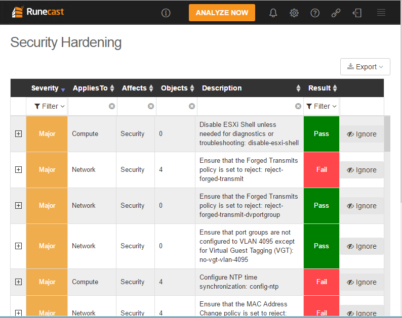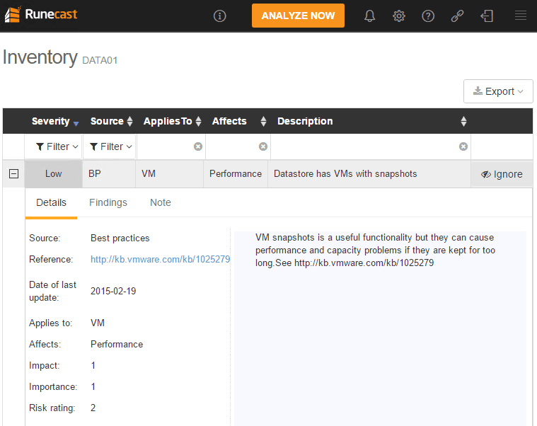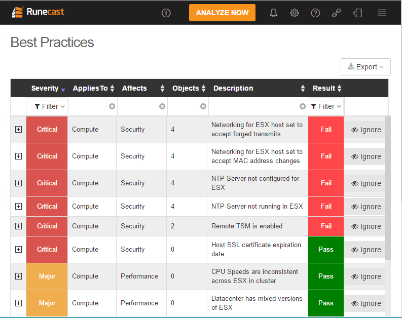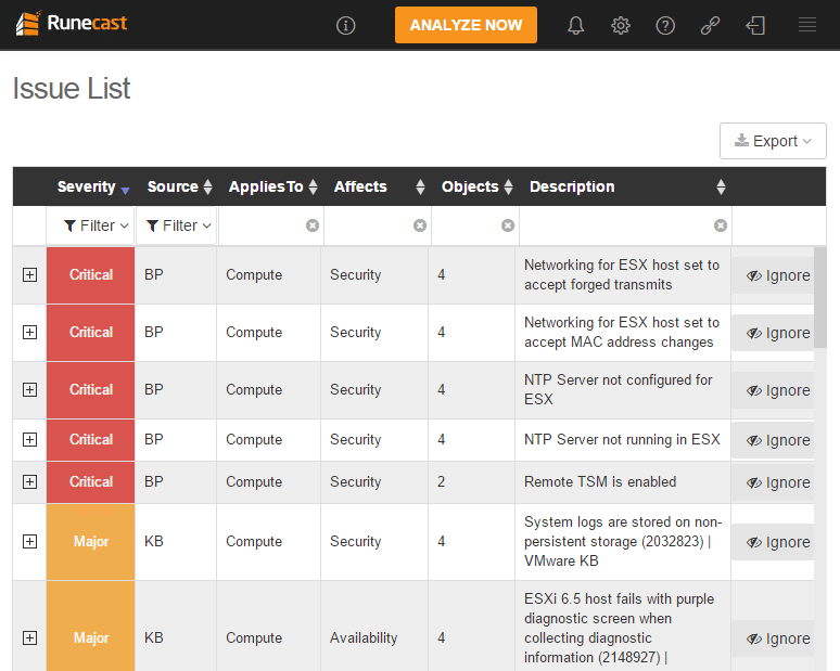 theย Issue List is an extremely easy to read expandable table format that is listed from the most Critical issues down to the least critical. ย Exceptional information all available at our fingertips. ย A point to think about – How many hours would it take to have come up with this information manually? ย It would take most of us with our other day to day tasks many hours on top of the normal workload to compile this information. ย And, how would we do this on a regular basis? ย The value add of Runecast Analyzer from this aspect is huge!