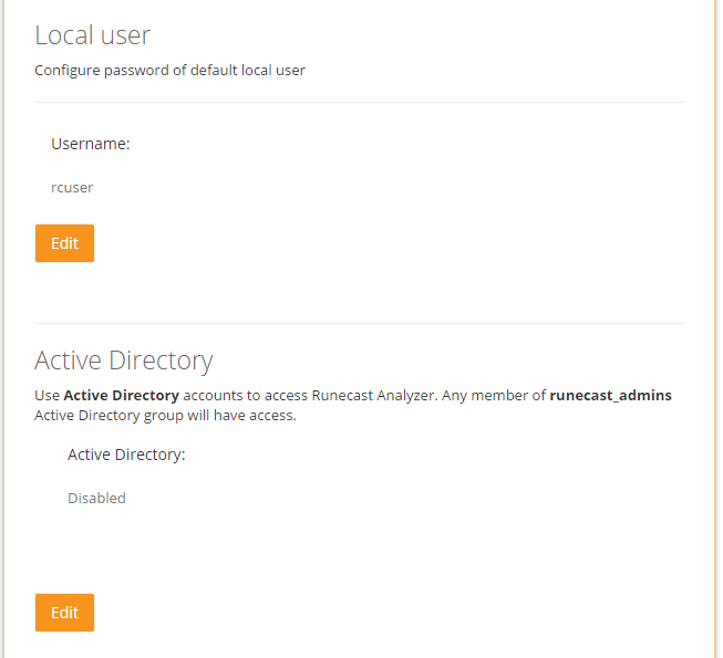 Theย User Profileย tab is where we can set the password to ourย rcuser account. ย Also, here we can configure Active Directory integration. ย We can enable the use ofย Active Directory accounts to access Runecast Analyzer. Any member of runecast_admins Active Directory group will have access. ย This is the default group that is configured to be the scope of Active Directory access, however, we can set any group we want to be the scope of Active Directory access.