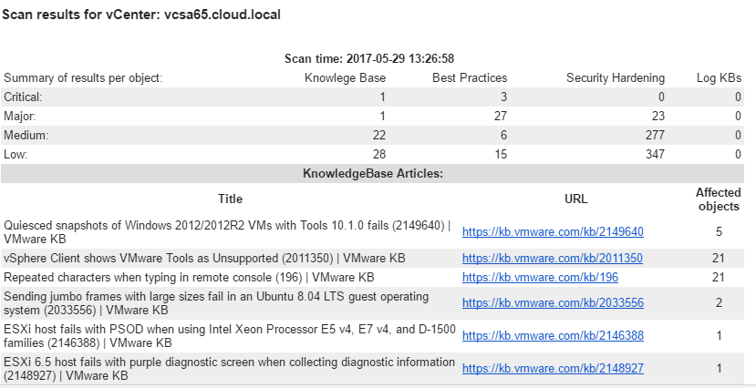 Below is an excerpt from an email I received from the appliance after an analysis run. ย The results are sent in a very easy to read table with links to all the VMware KB articles that apply!