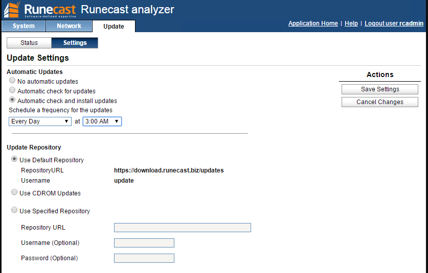 There are a couple of tabs hereย Network andย Update to take note of. ย The Network tab allows us to manipulate network settings after the deployment of the appliance if need be. ย The Update tab allows us to setup the appliance automatic updates for the system and application. ย We can also choose different repository settings if we need.