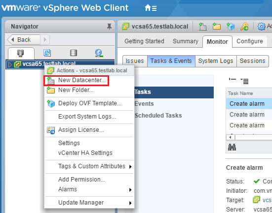 The first thing we need to do is create aย Datacenter. ย A Datacenterย is an aggregation of all the different types of objects needed to do work in virtual infrastructure: hosts, virtual machines, networks, and datastores. ย We need to create either a Datacenter or Folder to put our cluster in. ย Since a Datacenter holds all object types, this is our first step.