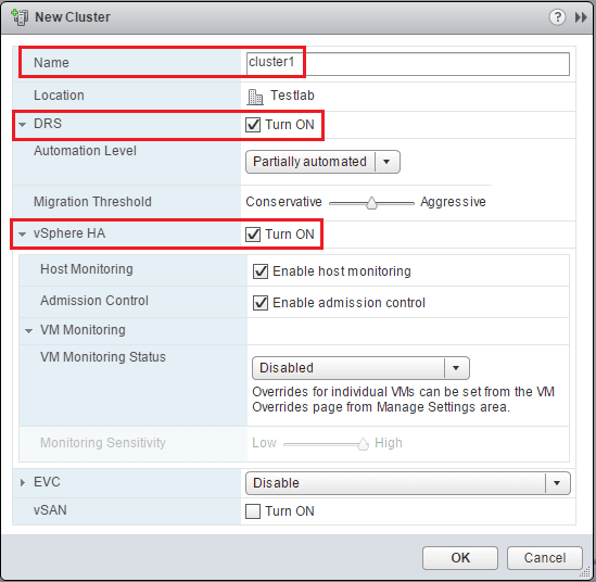 Once we choose theย New Cluster option by right clicking on our Datacenter, we have the options to Name the cluster, as well as setup DRS and vSphere HA. ย Distributed Resource Scheduler is what keeps the cluster resources balanced and new features in 6.5 even build more on on existing features. ย The vSphere HA feature uses a heartbeat mechanism to restart VM resources if they go down on a particular host.