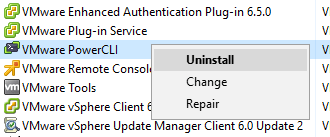 The first thing we need to do to move forward with the VMware PowerCLI 6.5.1 new way to install is we need to uninstall the old MSI file. Â To do this we simply remove the program in programs and features.