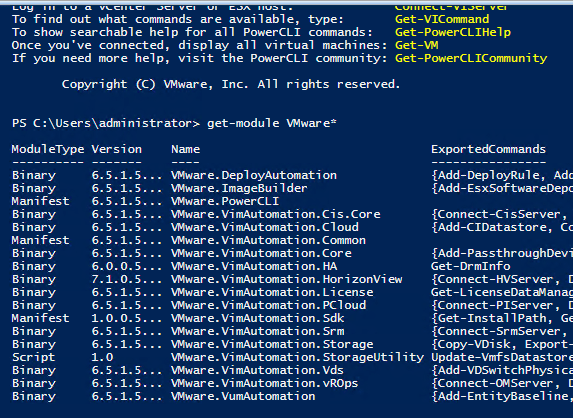 After the installation is complete, you can verify you are using the latest VMware PowerCLI version 6.5.1 by using the get-module command like so.