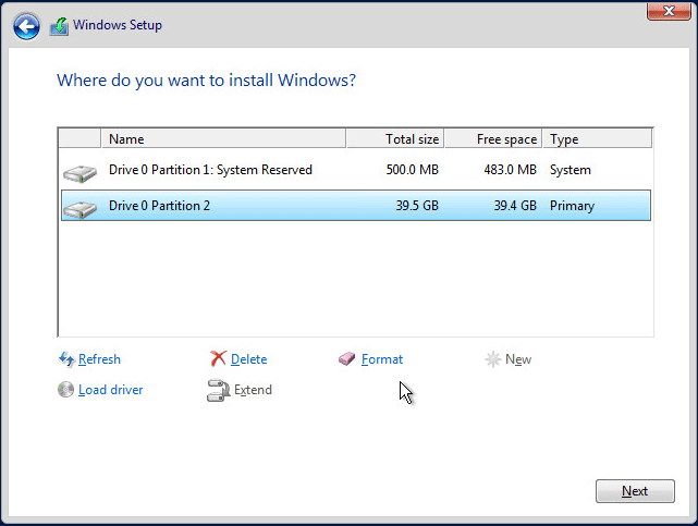 Boot Drives – You cannot format a boot volume as ReFS.  As you can see below from the screenclips of Windows Server 2016 installation, there is no option to format in ReFS.  If you click Format you simply get the notice about data loss – no option of file system mentioned.