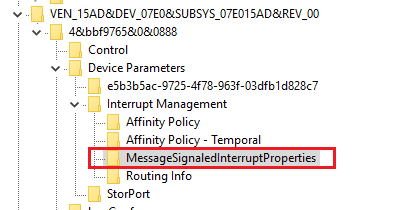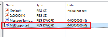 Navigating in the registry to the affected device, you should have aย Device Parameters >> Interrupt Management >> MessageSignaledInterruptProperties and thenย MSISupportedย REG_DWORD.