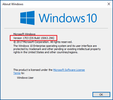 After the upgrade process was complete, I verified that the VM was now running version 1703, which it was.