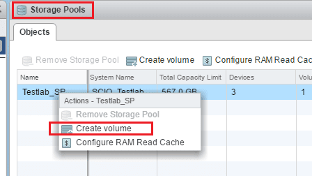 Using the vSphere web client to add a volume in ScaleIO after we have provisioned the system, we navigate toย ScaleIO >> Storage Pools >> Create volume.