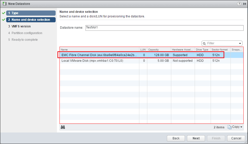 On our ESXi hosts, we need to rescan our storage adapters. ย After we do a rescan, we should be able to Add a new datastore and see theย EMC Fibre Channel Disk presented as available to our ESXi host.