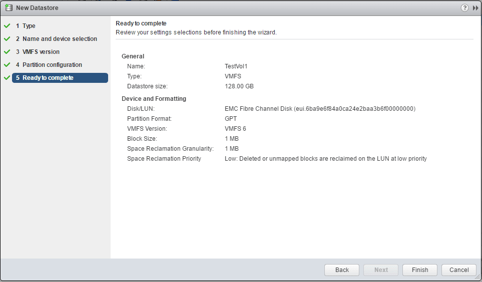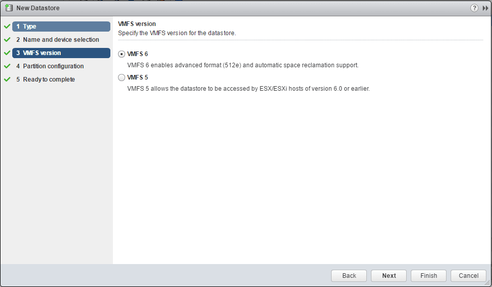 The rest is standard “add a datastore” options, including which VMFS version we want to format our datastore as.