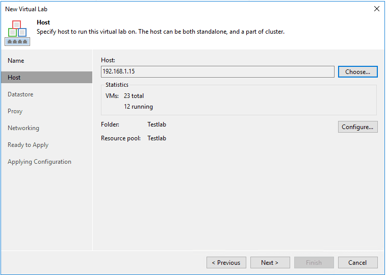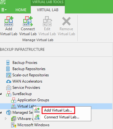 To get to the Virtual Lab setup, we navigate to Backup Infrastructure, SureBackup, and Virtual Labs.  Click Add Virtual lab.
