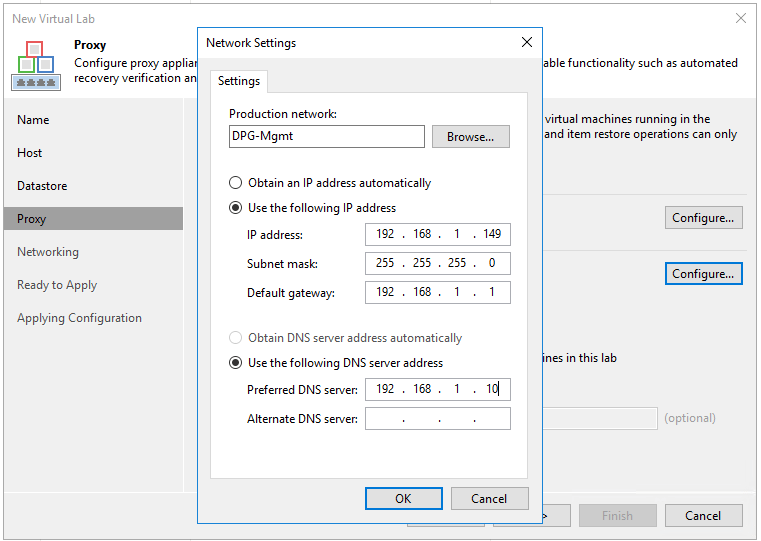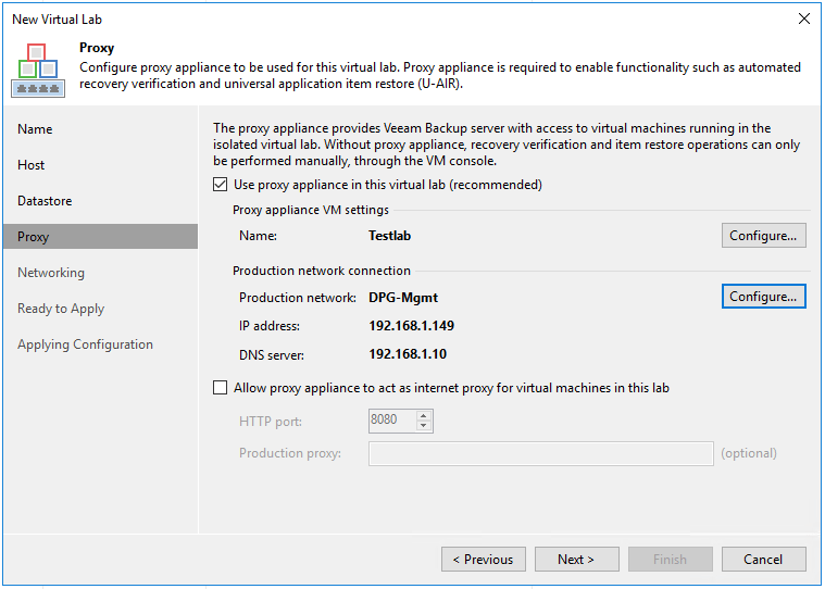 The next configuration we pay attention to is the Proxy configuration.  Here we select a Production network and then choose our options for IP address.  This is the interface on the Virtual Lab router that actually connects to your production network.