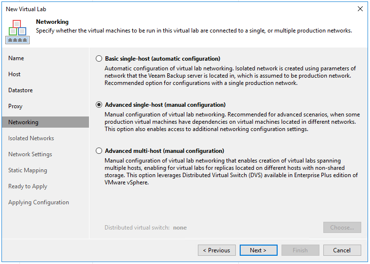 On the Networking screen, we select how we want to perform the configuration.  Here I am choosing Advanced single-host (manual configuration) as this allows for more granular configuration.
