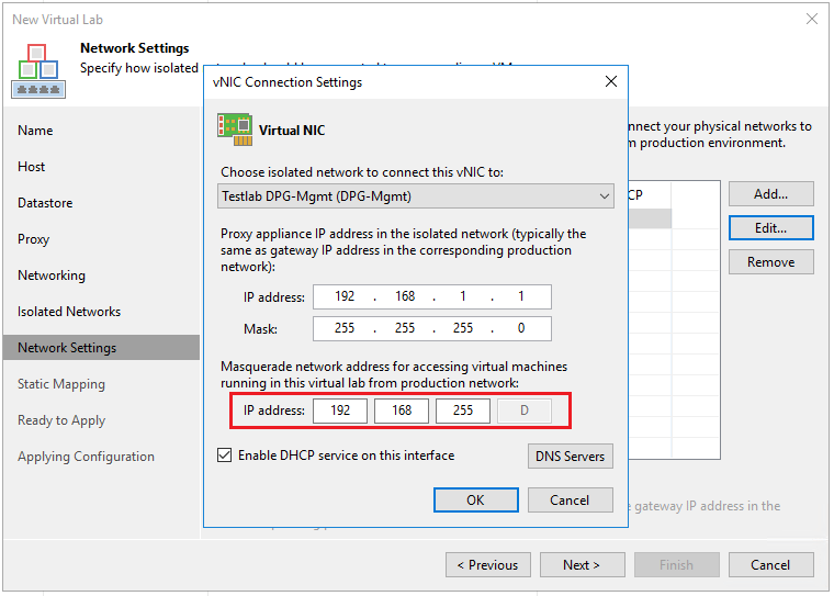 The masquerade network address is important as this is the netmap rule that gets created on the Virtual Lab router that is the address that you connect to from the real outside production network to speak to the internal VM that is running the overlapping IP address.