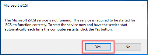 You will see a dialog box pop up when you first launch the iSCSI initiator application. This dialog lets you know that the Microsoft iSCSI service is not running. If you click Yes, it will start the service and it will set the service to start automatically. When thinking about mounting storage, we definitely want the Microsoft iSCSI service to start automatically as this will allow any storage targets to mount when the server is started or rebooted, etc.