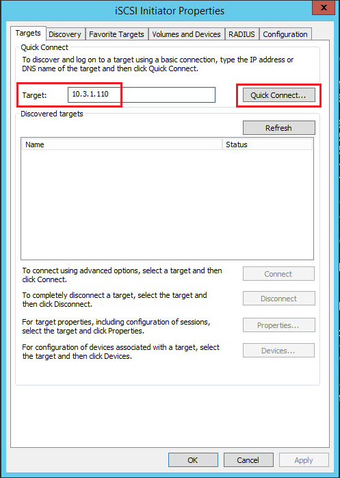 Now that we have the iSCSI Initiator Properties dialog box open, we can enter the IP address of the iSCSI Target. In my case there are no special connection considerations that I have setup for the FreeNAS target, so I can simply hit the Quick Connect button which will automatically connect to the iSCSI target.