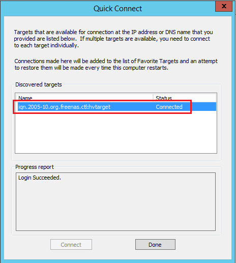 Notice when clicking the Quick Connect button, I see the Status of Connected and the target name matches the target setup in FreeNAS.
