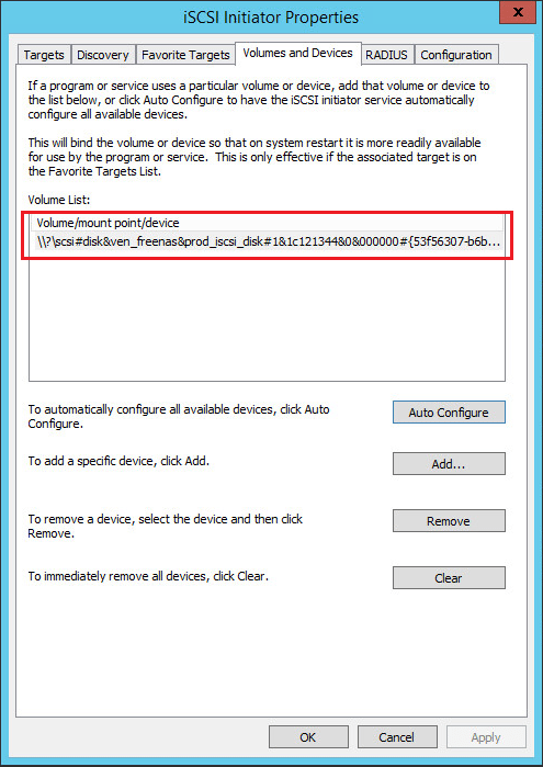 Next, we need to click the Volumes and Devices tab to setup the iSCSI volume. Again, here I click the Auto Configure option as this will automatically add and configure all available devices in the target.