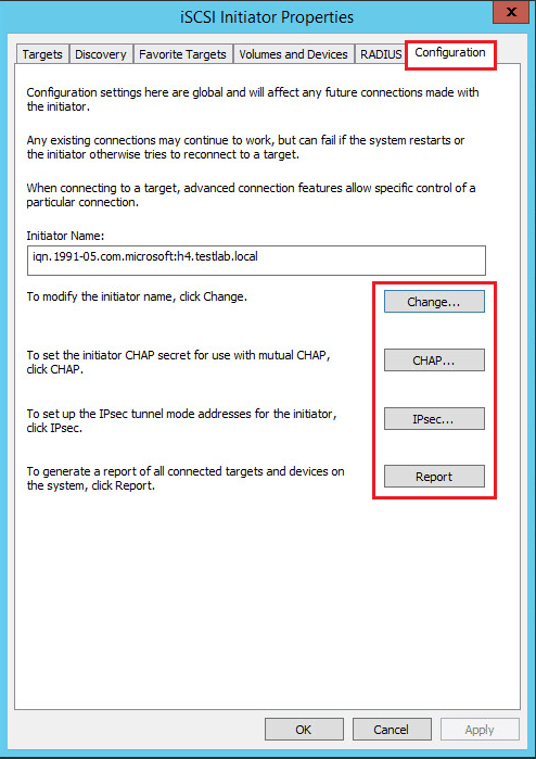 If you have any special considerations to be made in the configuration of the iSCSI connection, those can be setup under the Configuration tab. These include CHAP or IPsec credentials, etc. You can also generate reports about the connected targets and devices as well as change the initiator name from the configuration tab.