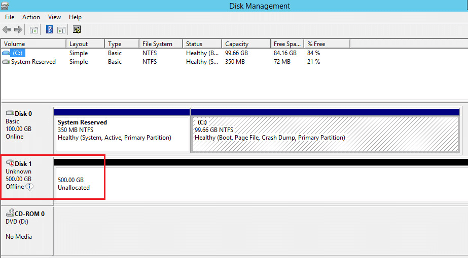 Our work is not done yet. We still need to add the volume in Windows Server 2016 Disk Management so the volume can actually be used by Windows. Notice below, after rescanning the disks we see our iSCSI volume now showing up. It will be added as Offline when it is brought in initially.