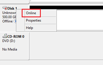 Right-click the new volume and select Online. This will bring the disk online.