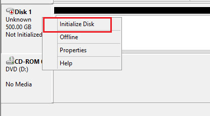 Next, we need to Initialize the disk. So again, we right-click and select Initialize Disk.
