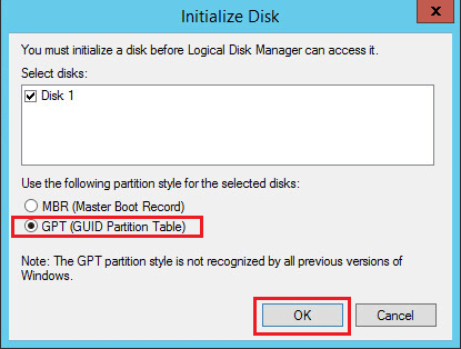 We have the option here for either MBR or GPT which for all volumes to support large volumes sizes, etc, we want to choose GPT.