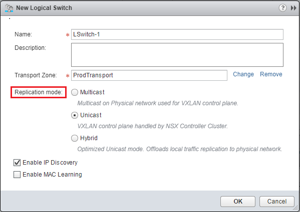 The logical switch is VMware’s implementation of VXLAN. ย This is an isolated network that can span multiple hosts, clusters, etc. ย However, we need a way to get that traffic out of the logical switch. ย We can do that with a distributed logical router, etc. ย First, to setup a logical switch, we navigate toย Networking & Security >> Logical Switches. ย We hit the green “+” sign to create a new Logical Switch. ย We choose theย replication mode which by default is set toย Unicast. ย This is the mode that requires no reconfiguration of the physical network such as IGMP snooping. ย It is however the least efficient as well.