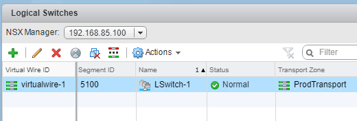 After creating the switch we see the new Logical Switch notated asย virtualwire-1. ย We see our friendly name however under theย Name column along with the status and transport zone, etc.