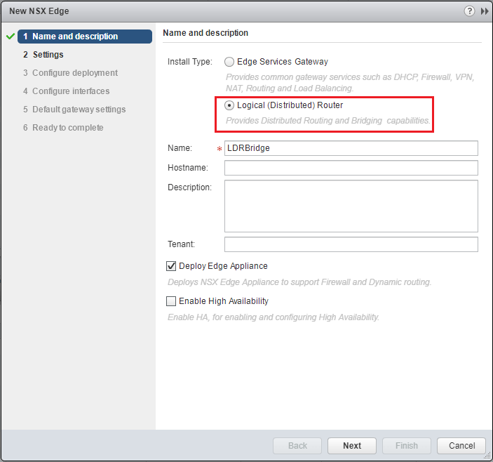 To setup the Distributed Logical Router layer 2 Bridge, we navigate to theย Networking & Security >> NSX Edges section. ย Hit the green “+” to create a new Distributed Logical Router. ย Here we selectย Logical (Distributed) Router and give it a name. ย We need to deploy Edge Appliance as well. ย If you uncheck this option, when you create the Bridge, you will get the error that Bridging is only available when an NSX Edge is deployed.