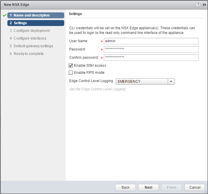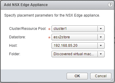 We are asked to configure the placement parameters for the NSX Edge appliance. ย The only two options that are required are theย Cluster/Resource Pool andย Datastore.
