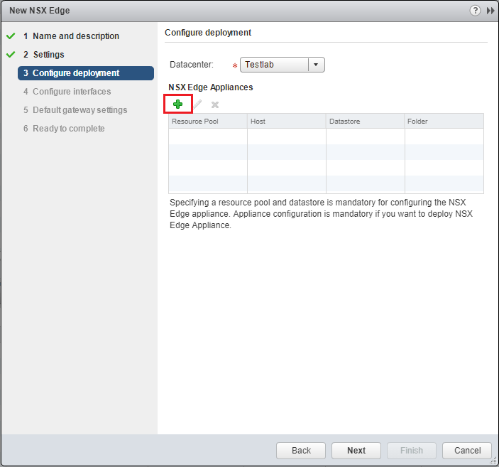 Next, we actually deploy our NSX Edge appliance. ย Click the green “+” sign.